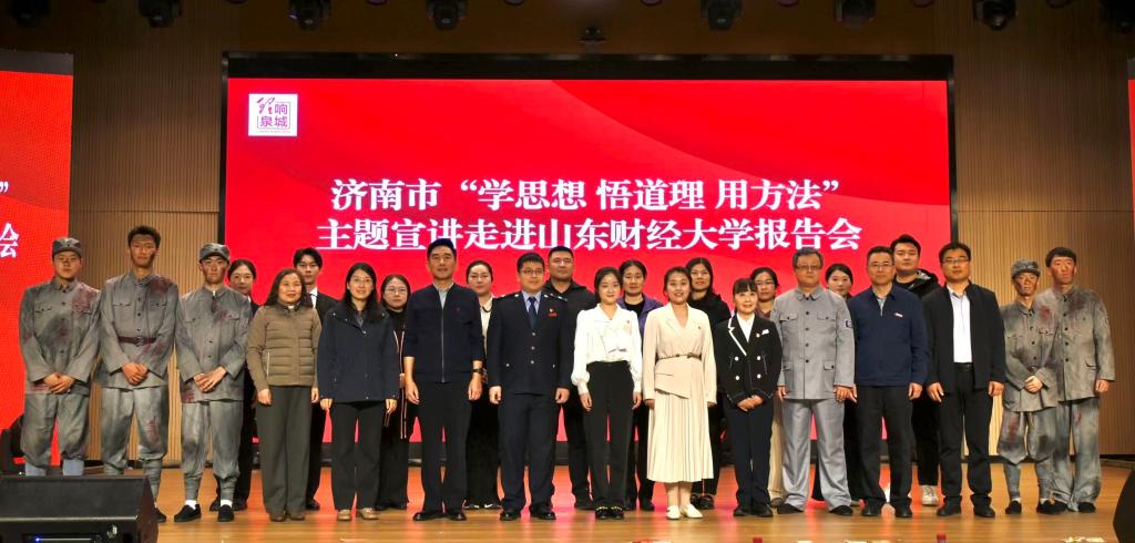 10月30日下午,济南市“学思想 悟道理 用方法”主题宣讲报告会在章丘校区大学生活动中心举办。报告会由济南市委宣传部主办,济南市委讲师团和我校党委宣传部、团委、437bwin必赢国际联合承办。济南市委讲师团团长刘健、副团长吕桂红出席报告会。来自不同领域的宣讲员们通过理论阐释、故事讲述、文艺表演等形式,为师生带来了一场深刻而动人的思想政治教育课。